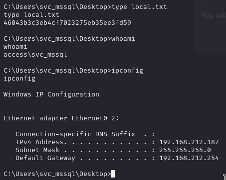 SMB 192.168.212.187 445 SERVER [+] access.offsec\svc_mssql:trustno1