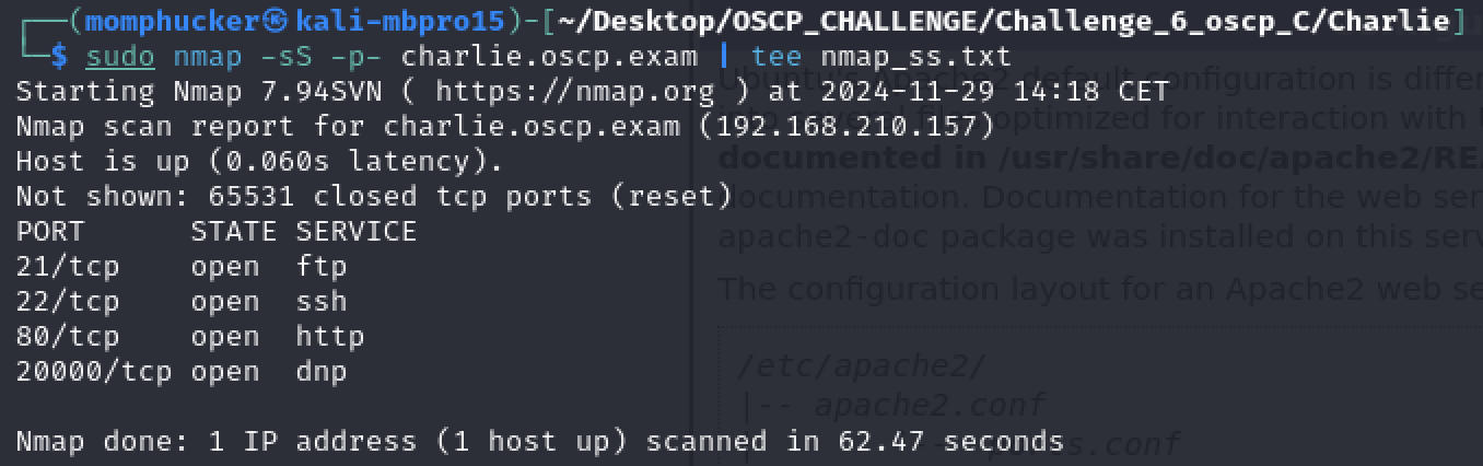 PORT SERVICE VERSION 21/tcp ftp vsftpd 3.0.5 22/tcp ssh OpenSSH 8.9p1 Ubuntu 3 (Ubuntu Linux; protocol 2.0) 80/tcp http Apache httpd 2.4.52 ((Ubuntu)) 20000/tcp dnp MiniServ 1.820 (Webmin httpd) Bash┌──(momphucker㉿kali-mbpro15)-[~/Desktop/OSCP_CHALLENGE/Challenge_6_oscp_C/Charlie] └─$ sudo nmap -sS -p- charlie.oscp.exam | tee nmap_ss.txt Starting Nmap 7.94SVN ( https://nmap.org ) at 2024-11-29 14:18 CET Nmap scan report for charlie.oscp.exam (192.168.210.157) Host is up (0.060s latency). Not shown: 65531 closed tcp ports (reset) PORT STATE SERVICE 21/tcp open ftp 22/tcp open ssh 80/tcp open http 20000/tcp open dnp Nmap done: 1 IP address (1 host up) scanned in 62.47 secondsScreenshot: