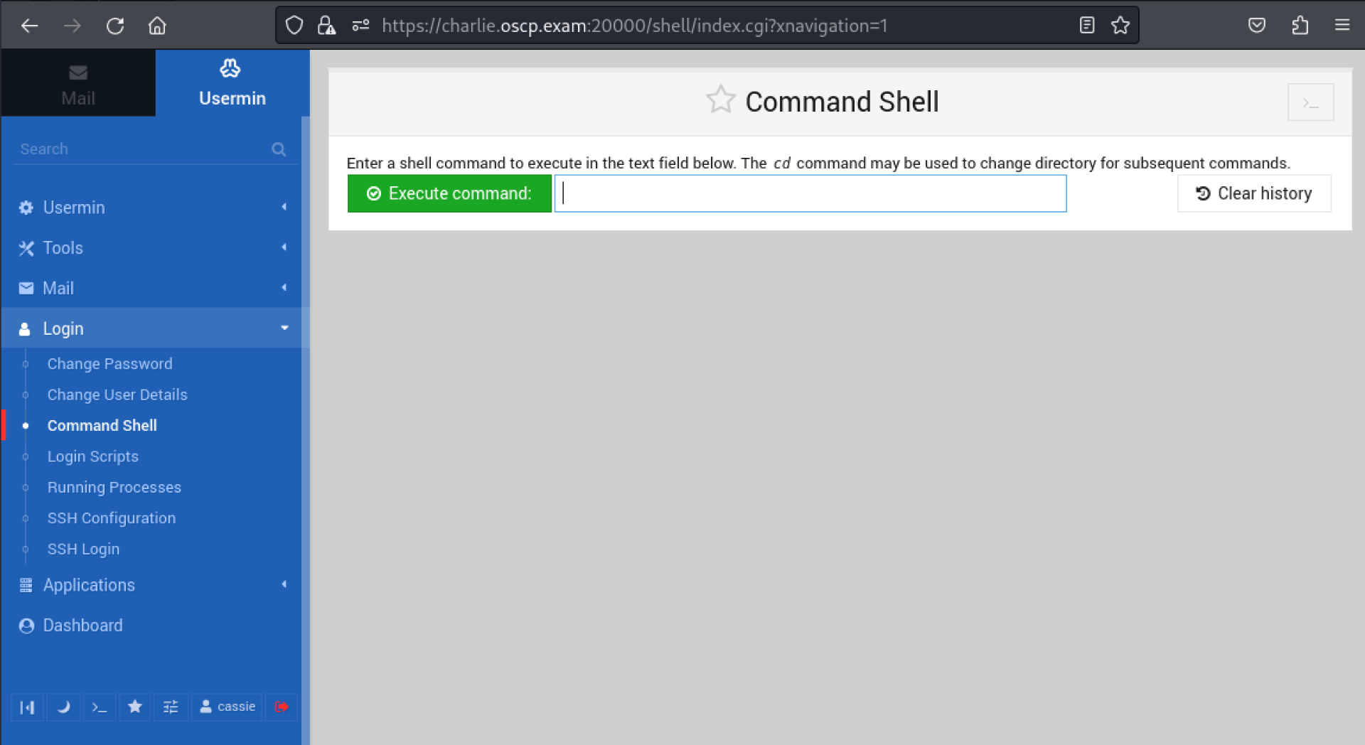 Con le stesse credenziali (cassie:cassie) si ha accesso alla webapp. All'interno della stessa, è presente la pagina Command Shell in Usermin --> Login --> Command Shell. Sembrerebbe essere possibile eseguire dei comandi.