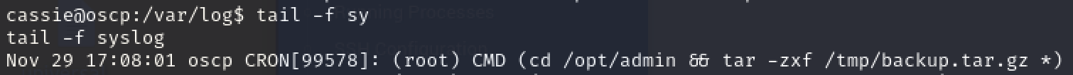 Nov 29 17:08:01 oscp CRON[99578]: (root) CMD (cd /opt/admin && tar -zxf /tmp/backup.tar.gz *)