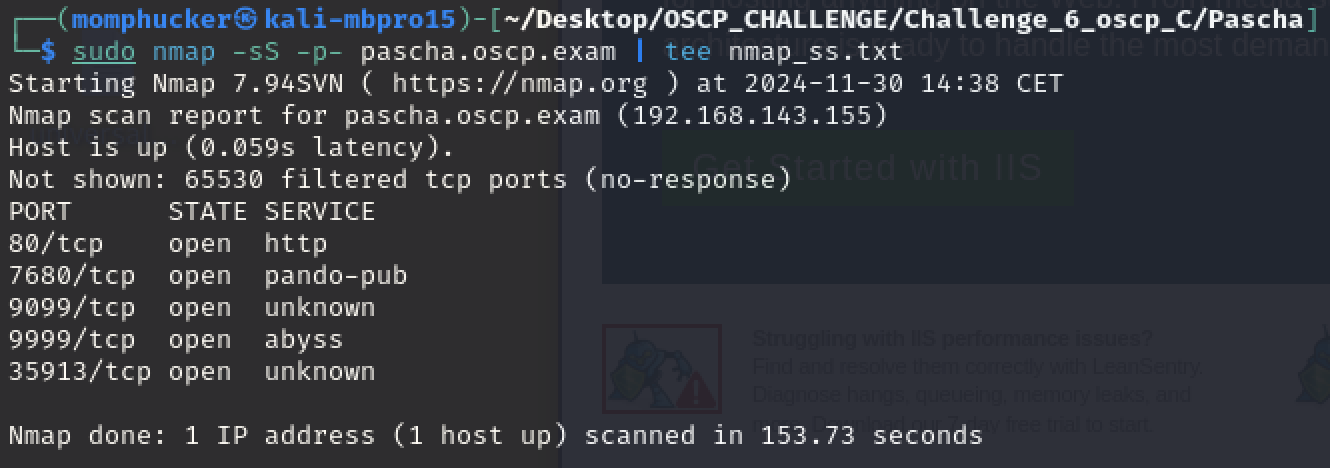 PORT SERVICE VERSION 80/tcp http Microsoft IIS httpd 10.0 7680/tcp pando-pub 9099/tcp unknown 9999/tcp abyss 35913/tcp unknown Bash┌──(momphucker㉿kali-mbpro15)-[~/Desktop/OSCP_CHALLENGE/Challenge_6_oscp_C/Pascha] └─$ sudo nmap -sS -p- pascha.oscp.exam | tee nmap_ss.txt Starting Nmap 7.94SVN ( https://nmap.org ) at 2024-11-30 14:38 CET Nmap scan report for pascha.oscp.exam (192.168.143.155) Host is up (0.059s latency). Not shown: 65530 filtered tcp ports (no-response) PORT STATE SERVICE 80/tcp open http 7680/tcp open pando-pub 9099/tcp open unknown 9999/tcp open abyss 35913/tcp open unknown Nmap done: 1 IP address (1 host up) scanned in 153.73 seconds