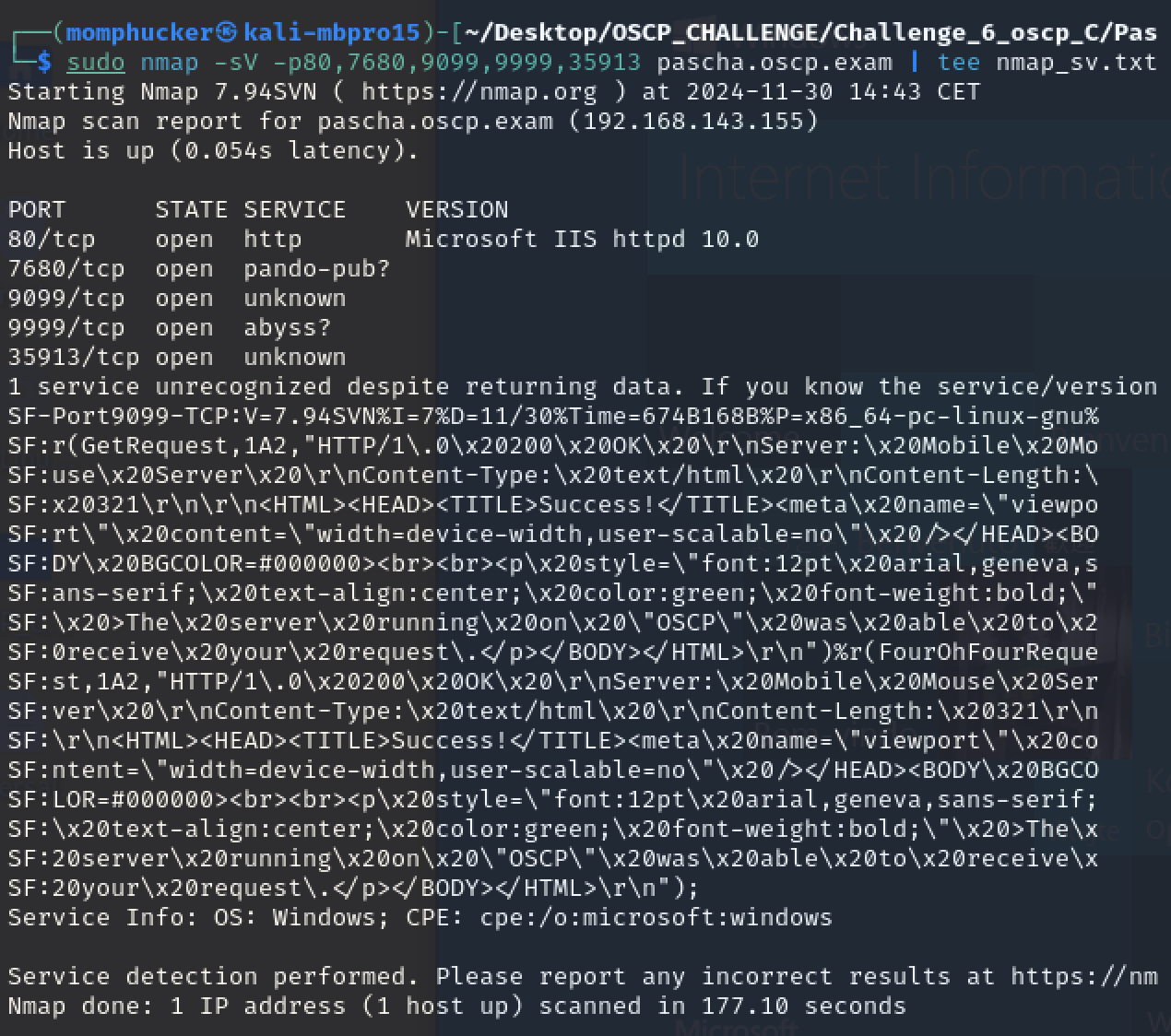 └─$ sudo nmap -sV -p80,7680,9099,9999,35913 pascha.oscp.exam | tee nmap_sv.txt