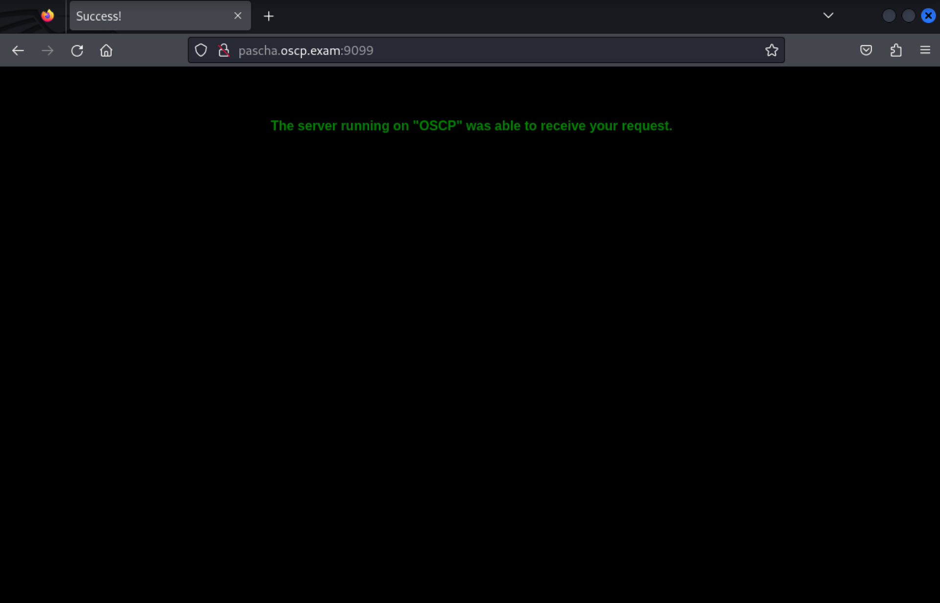 | <HTML><HEAD><TITLE>Success!</TITLE><meta name="viewport" content="width=device-width,user-scalable=no" /></HEAD><BODY BGCOLOR=#000000><br><br><p style="font:12pt arial,geneva,sans-serif; text-align:center; color:green; font-weight:bold;" >The server running on "OSCP" was able to receive your request.</p></BODY></HTML>