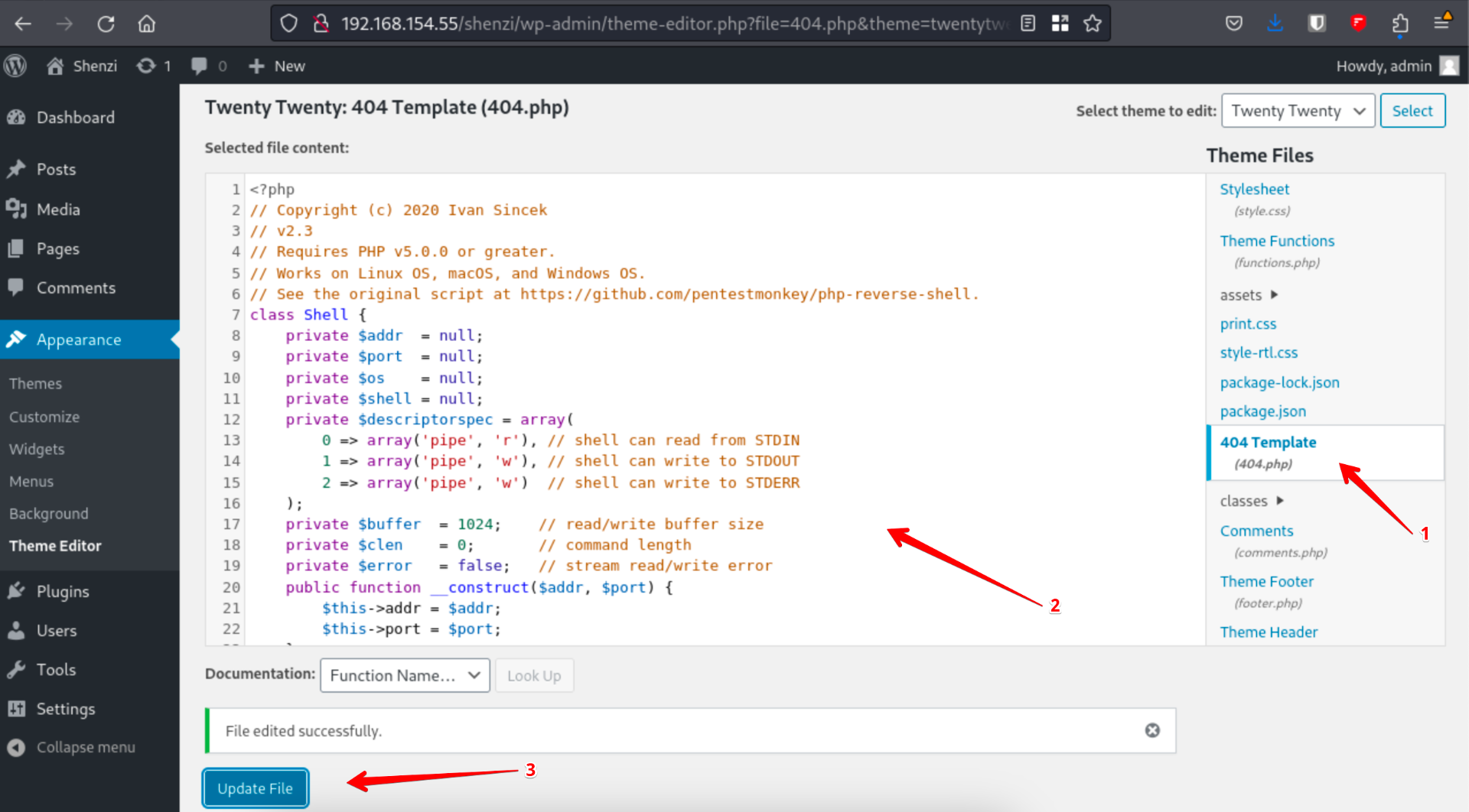 e visitato una pagina del sito wordpress che non esiste in modo da attivare la pagina 404, ad esempio http://192.168.154.55/shenzi/404, ed eseguire il paylod.