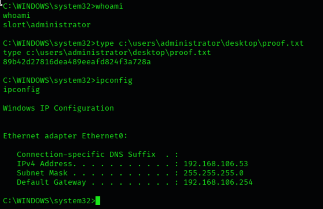 Dopo qualche istante viene aperta la shell come Administrator sul listener in ascolto: