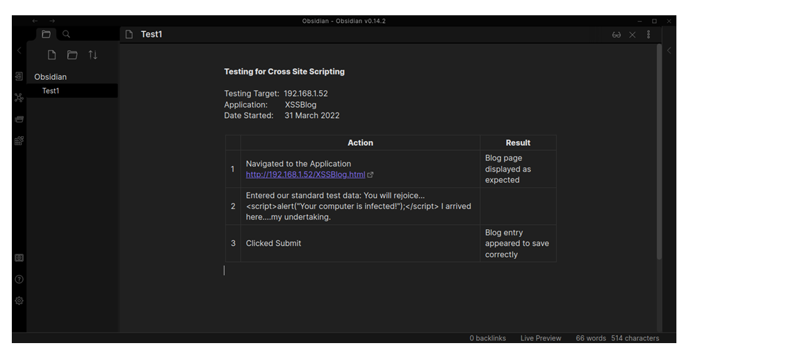 We now have a simple, fast, and expandable way to take coherent and comprehensive notes that another tester can follow. It's worth repeating that the notes are not themselves the report we will deliver to the client, but they will be invaluable when we attempt to put our report together later.