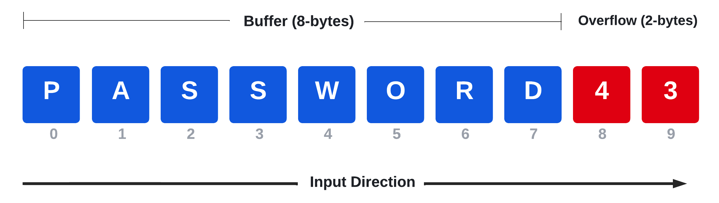 In this diagram, a buffer has been designed to contain a password that can be a maximum of 8 bytes. If a user provides an input consisting of the characters "password" followed by the numbers "4" and "3", the last two digits are going to overflow the buffer by two bytes. If not handled correctly, this event might lead to unexpected behavior, as we'll observe shortly.