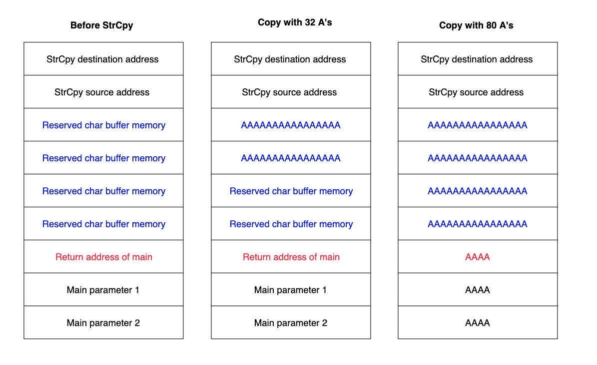 This image illustrates three different states of the stack. In the leftmost column, the buffer has been initialized at runtime and its space reserved in memory. Below this, in red, the return address holds the correct memory address. In the central panel, the user input contains just 32 characters, meaning it fills only half of the available buffer. However, in the scenario on the right, the user has sent 80 "A" characters, thus filling out the entire 64-byte long buffer and overwriting the return address.