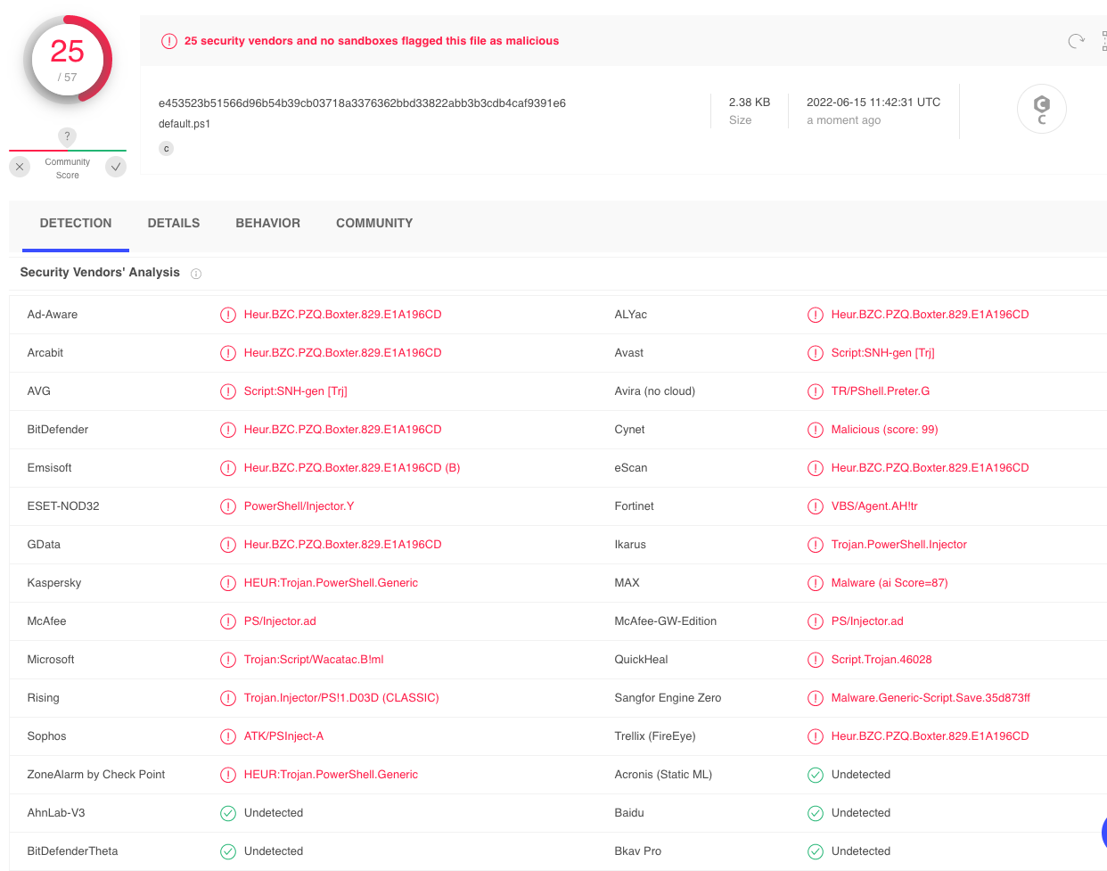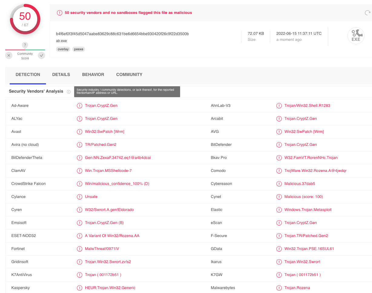 Figure 1: Virustotal results on the msfvenom payload.