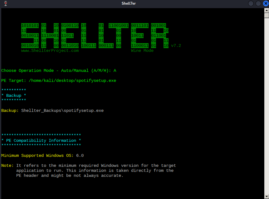 To start, we'll need to tell Shellter the Spotify installer location on our local Kali machine. In this case, it is /home/kali/desktop/spotifysetup.exe. Before analyzing and altering the original PE in any way, Shellter will first create a backup of the file.