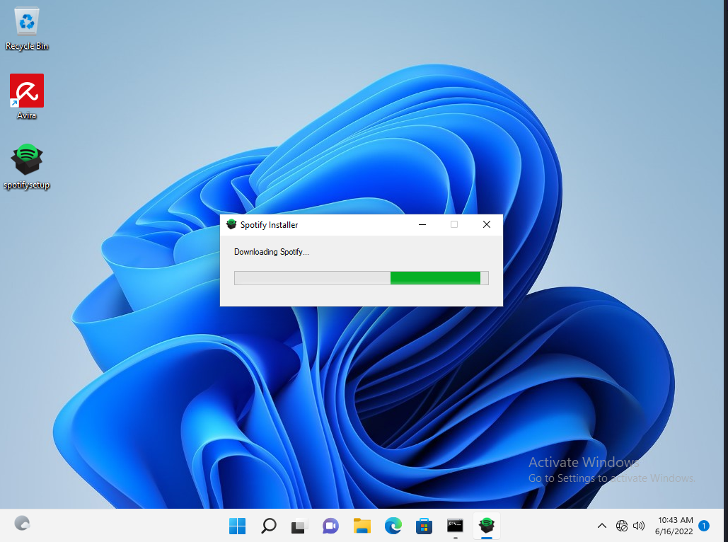 Once we execute the file, we are presented with the default Spotify installation window, which under normal circumstances will download the Spotify package over the internet. Because our VM has no internet connection, the Spotify installer will hang indefinitely.