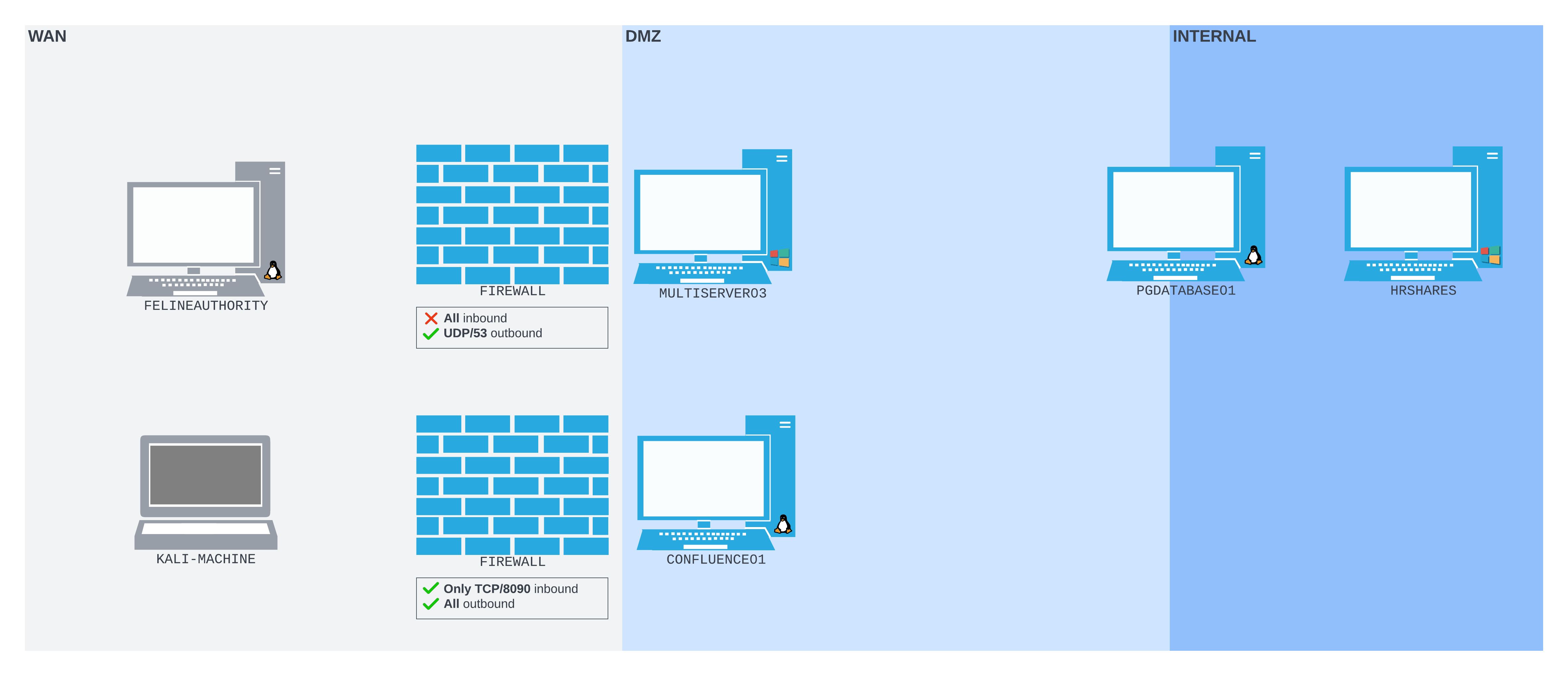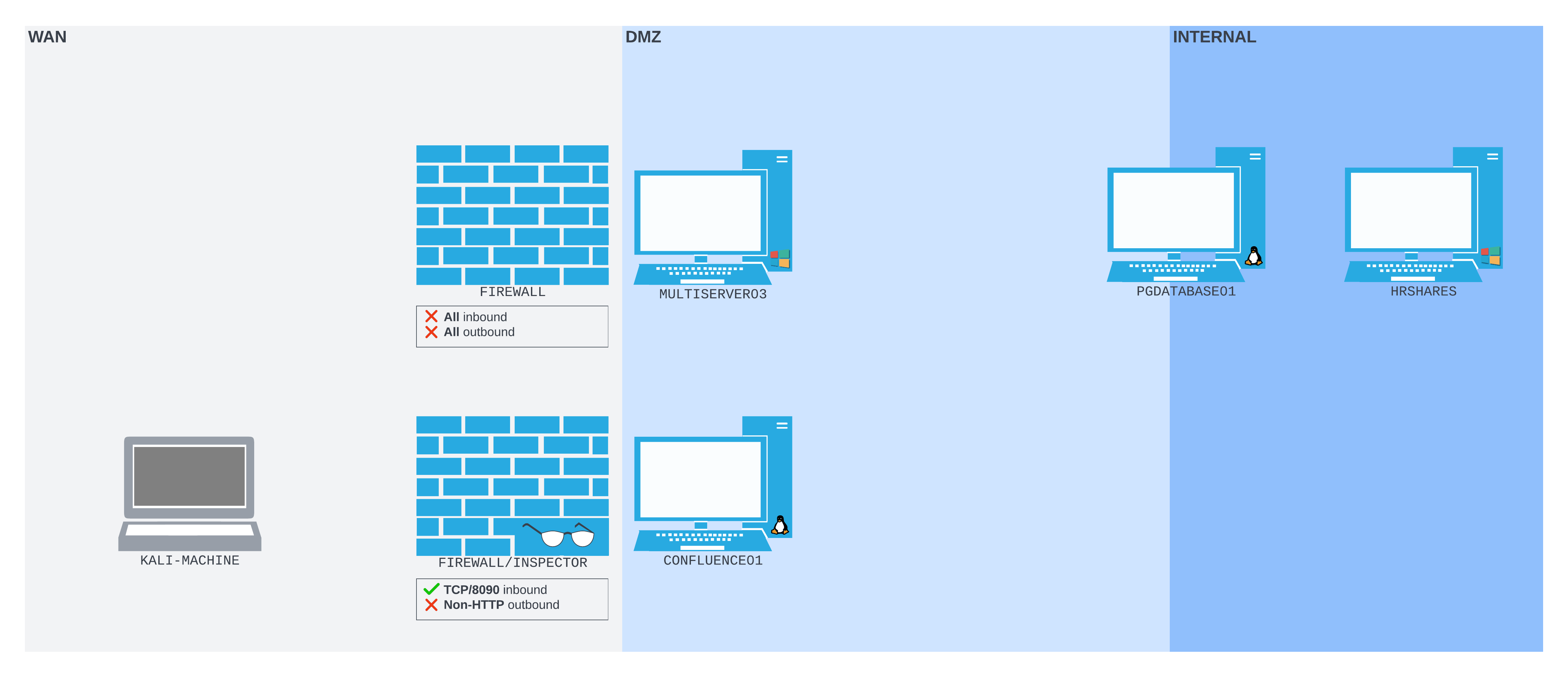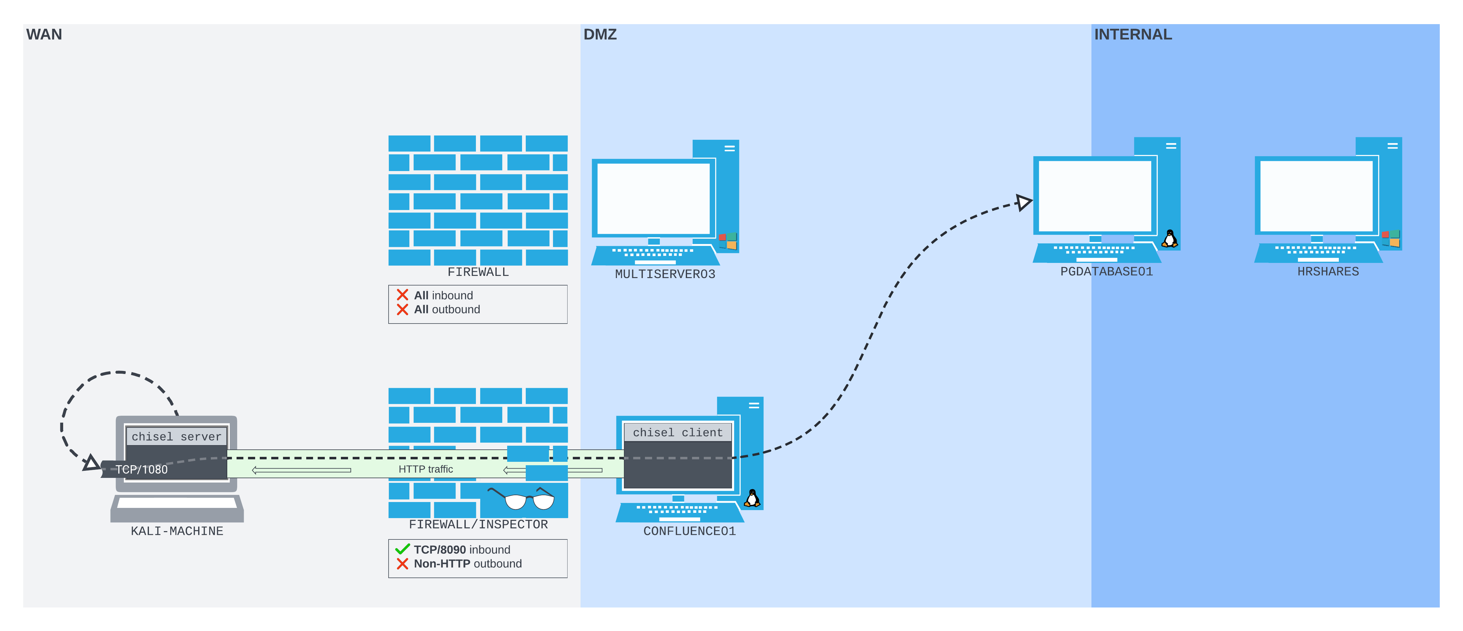 Let's begin our exploration of HTTP tunneling by introducing a simple scenario. In this case, we have compromised CONFLUENCE01, and can execute commands via HTTP requests. However, once we try to pivot, we are blocked by a considerably restrictive network configuration.