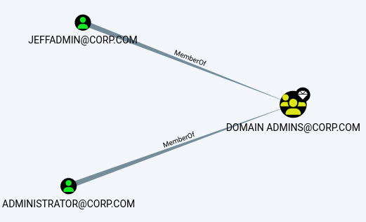 Back on the Bloodhound view, the Domain Admins for the domain are indeed jeffadmin and the administrator account itself. As shown in Figure below, BloodHound shows an edge in the form of a line between the user objects and the Domain Admins group, indicating the relationship, which in this case tells us that the particular users are a member of the given group: