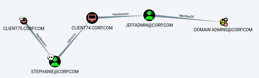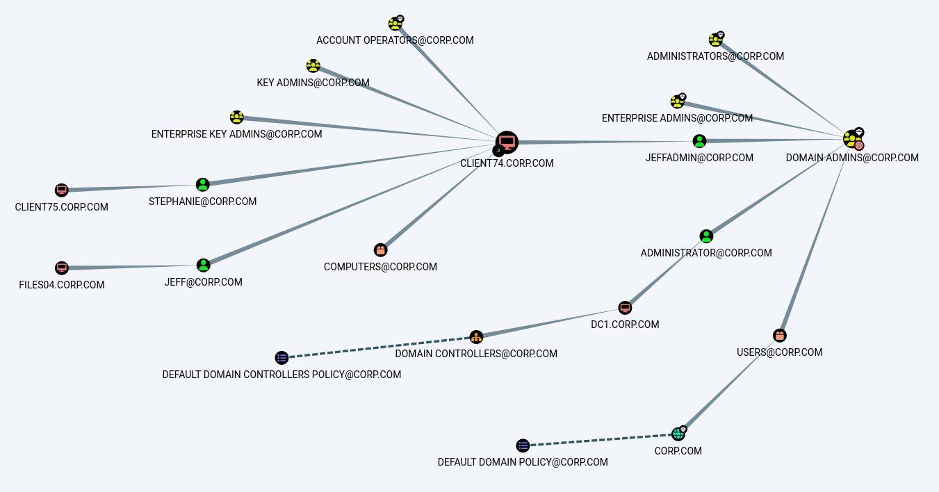 After further reading of Figure 11, and after further inspection of the graph, we discover the connection jeffadmin has to CLIENT74. This means that the credentials for jeffadmin may be cached on the machine, which could be fatal for the organization. If we are able to take advantage of the given attack path and steal the credentials for jeffadmin, we should be able to log in as him and become domain administrator through his Domain Admins membership.
