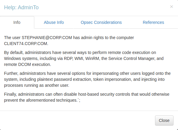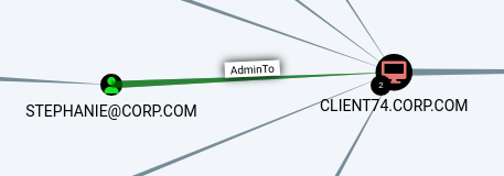 The small pop-up says AdminTo, and this indicates that stephanie indeed has administrative privileges on CLIENT74. If we right-click the line between the nodes and click ? Help, BloodHound will show additional information: