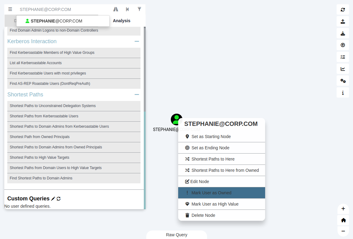 In order for us to obtain an owned principal in BloodHound, we will run a search (top left), right click the object that shows in the middle of the screen, and click Mark User as Owned. Since we are already at a the user stephanie we can simply right-click and select Mark User as Owned A principal marked as owned is shown in BloodHound with a skull icon next to the node itself.