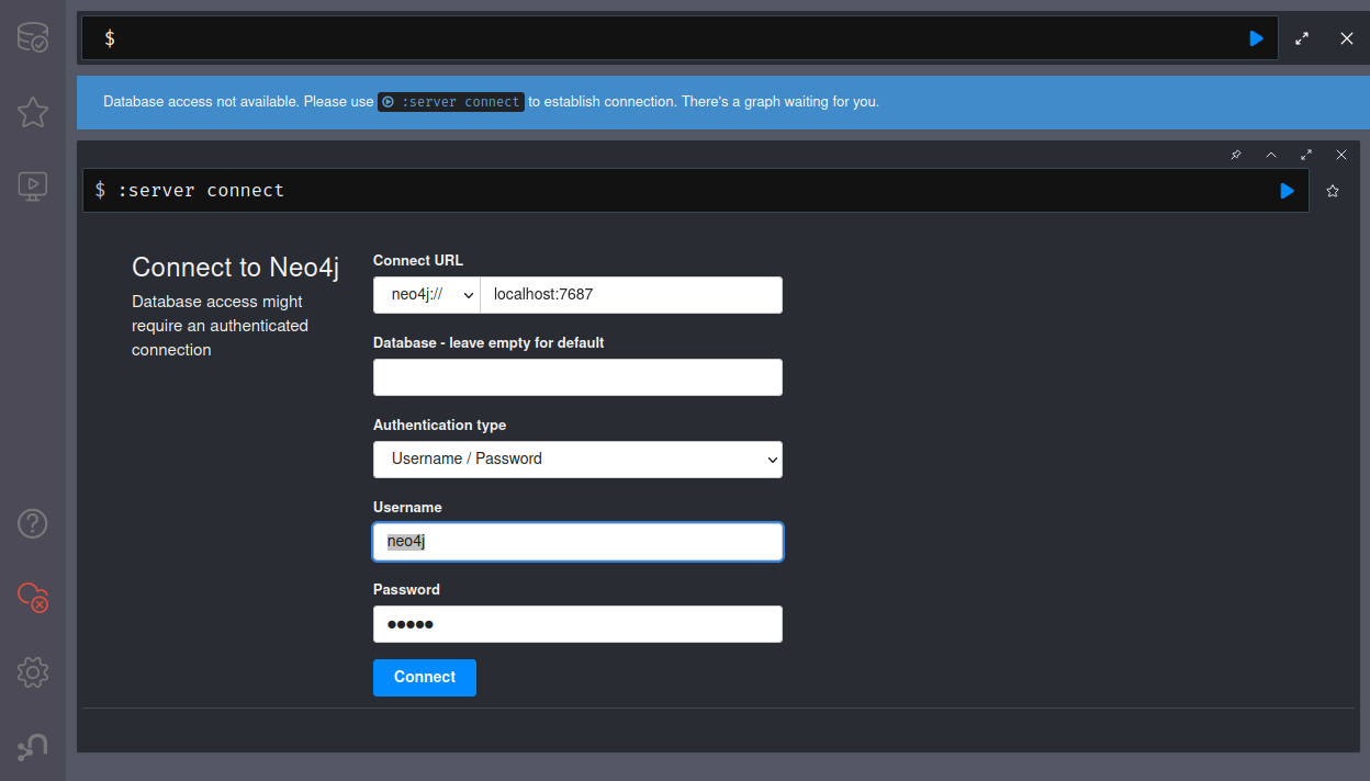 Listing 81 - Starting BloodHound in Kali LinuxOnce we start BloodHound, we are met with an authentication window, asking us to log in to the Neo4j Database: