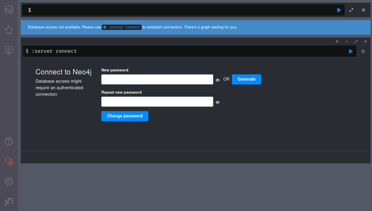 As indicated in the output, the Neo4j service is now running and it should be available via the web interface at http://localhost:7474. Let's browse this location and authenticate using the default credentials (neo4j as both username and password):