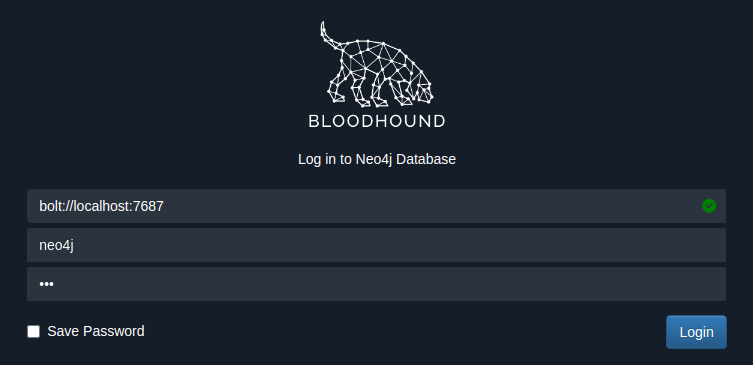 As indicated by the green check mark in the first column, BloodHound has automatically detected that we have the Neo4j database running. In order to log in, we use the neo4j username and the password we created earlier.