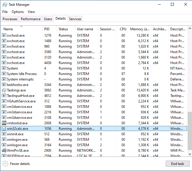 If we were logged in on that machine and monitoring Task Manager we would see the win32calc.exe process appear with jen as the user.